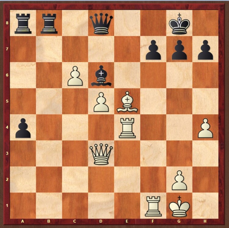 29… Qd8 ( Er kan volgen… 30. Bxg7 Kxg7 ( 30… Rb4 31. Rxb4 Bxb4 32. Qg3 Qd6 33. Be5+ Qg6 34. Qf4 Bc5+ 35. Kh2 a3 36. c7 a2 37. d6 Bxd6 38. Bxd6 ) 31. Qd4+ f6 32. Rg4+ Kf7 33. Qe4 Bc5+ 34. Kh1 Qc8 35. Qxh7+ Ke8 36. Rg8+ Bf8 37. Re1+ )