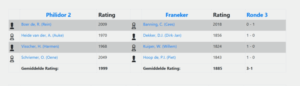 Toen ik mijn partij in het bargedeelte analyseerde met Rein, hoorde ik dat de uitslag bij Auke alle kanten op kon gaan. Voordat ik kans had om zelf even te kijken kwam Auke met een grijns de analyseruimte binnen, hetgeen vermoedde dat hij gewonnen had. En dat vermoeden was juist. Na een wat onhandige torenzet van zijn tegenstander Dirk-Jan, was Auke er als de kippen bij om hem mat te zetten via de 7e rij. In de analyse probeerde Auke ons te overtuigen dat hij sowieso gewonnen stond, maar daarin slaagde hij niet helemaal. Nu kreeg hij van ons de kans om in dit verslag alsnog met een sluitende variant te komen, maar tot nu toe is dat nog niet gebeurd. Neemt niet weg dat Auke weer op de weg terug is en een belangrijke bijdrage heeft geleverd aan de resultaten van Philidor 2, zowel in de FSB als ook in de KNSB.