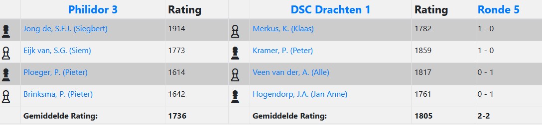Toen was Pieter Ploeger nog bezig. Het was een Italiaanse partij. Pieter kreeg de betere pionnenstelling. Tegenstander had een geisoleerde pion in het centrum. Het was de laatste partij. Pieter moest even bijtanken en waarschijnlijk tankte hij diesel in plaats van Euro. Hij raakte langzaam de grip op de partij kwijt. Remise was voldoende. Dat bood hij ook aan, maar werd afgeslagen. Ook de klok tikte door en Pieter moest opgeven. Jammer. 2-2.