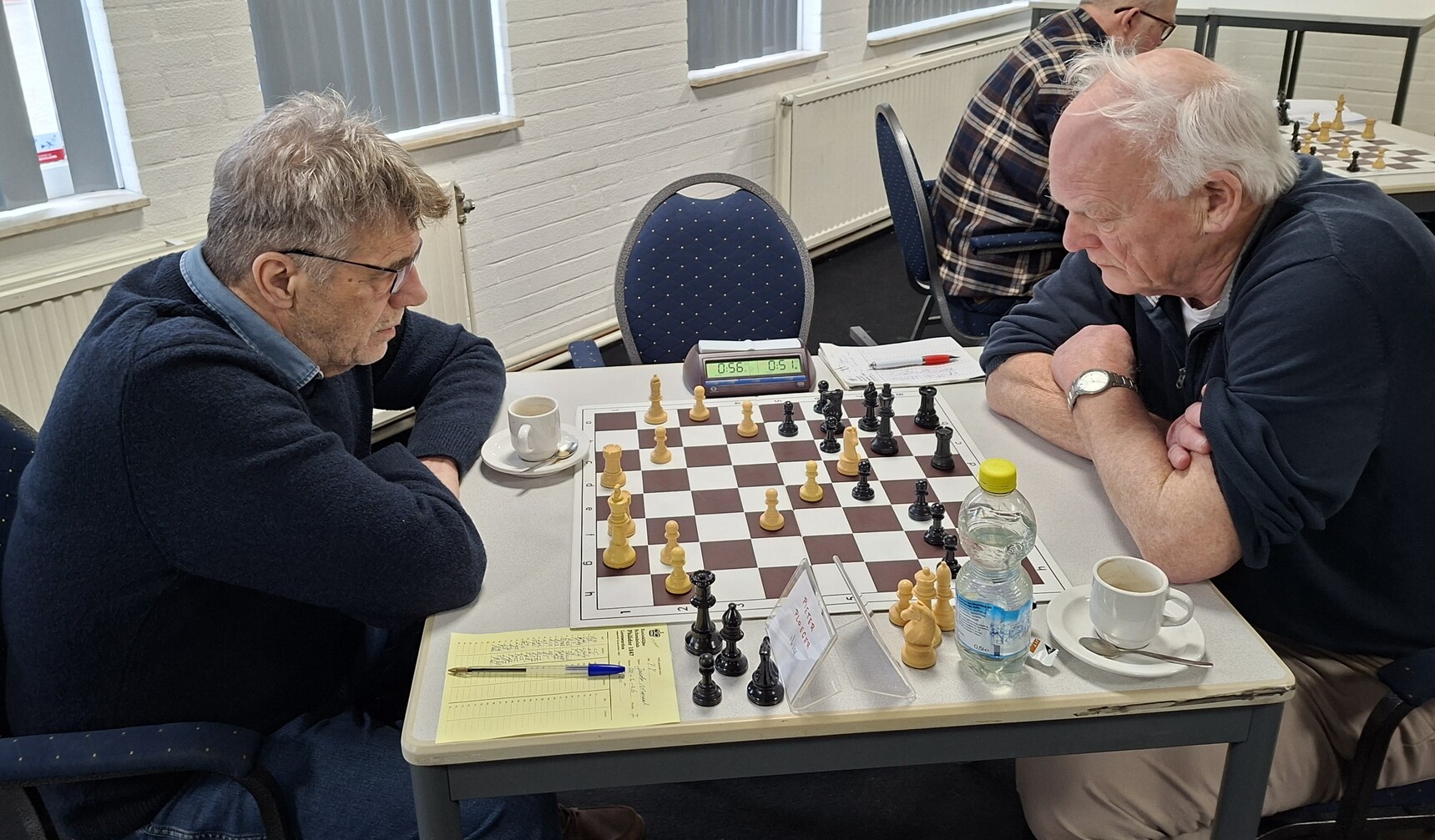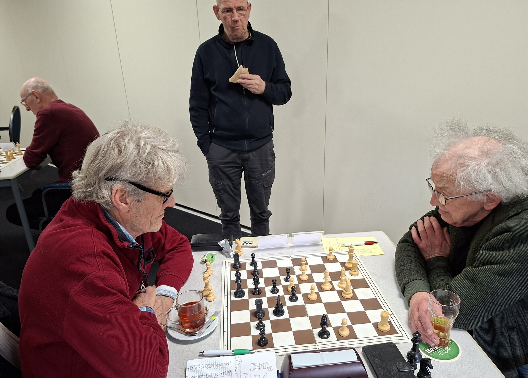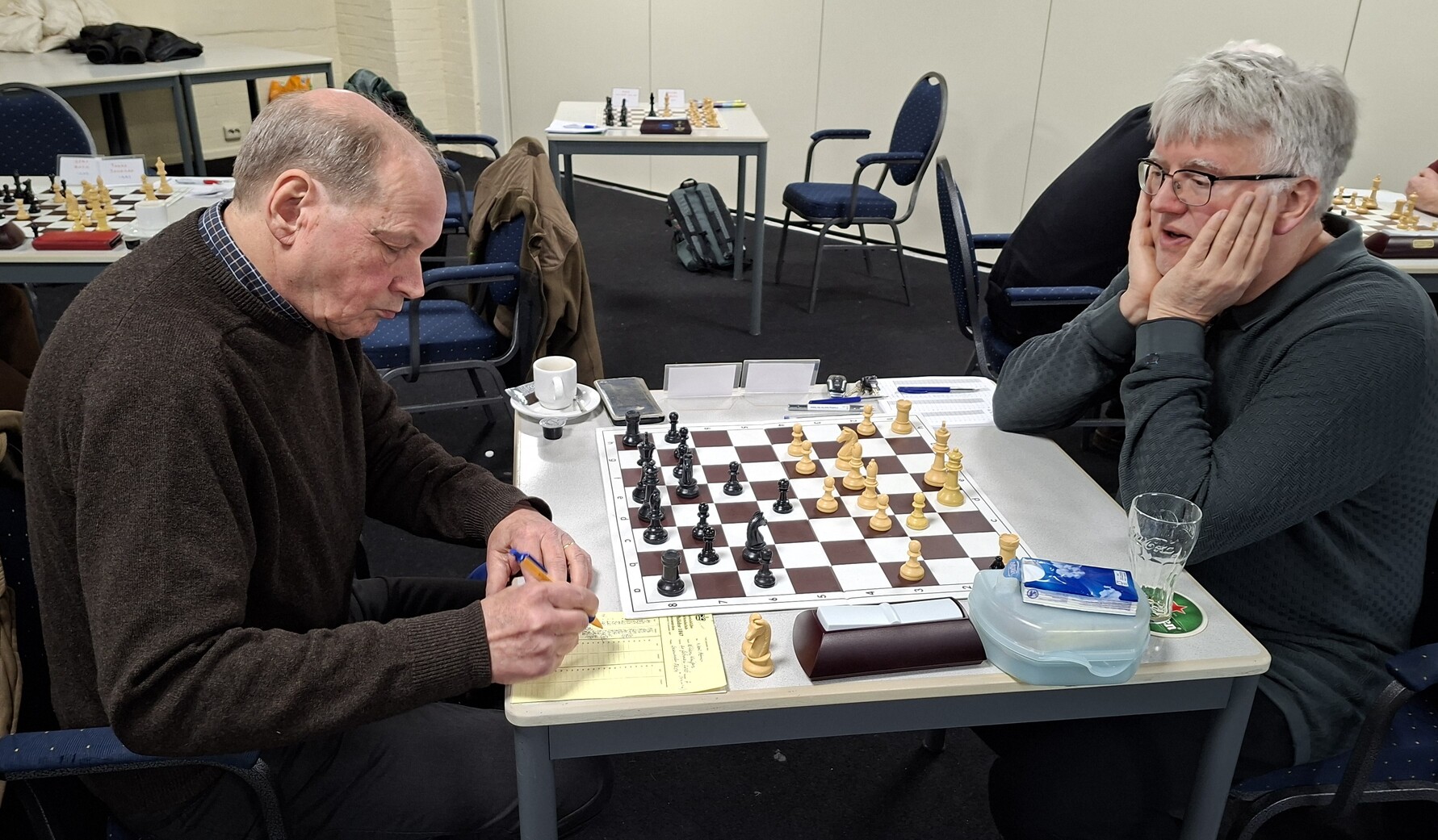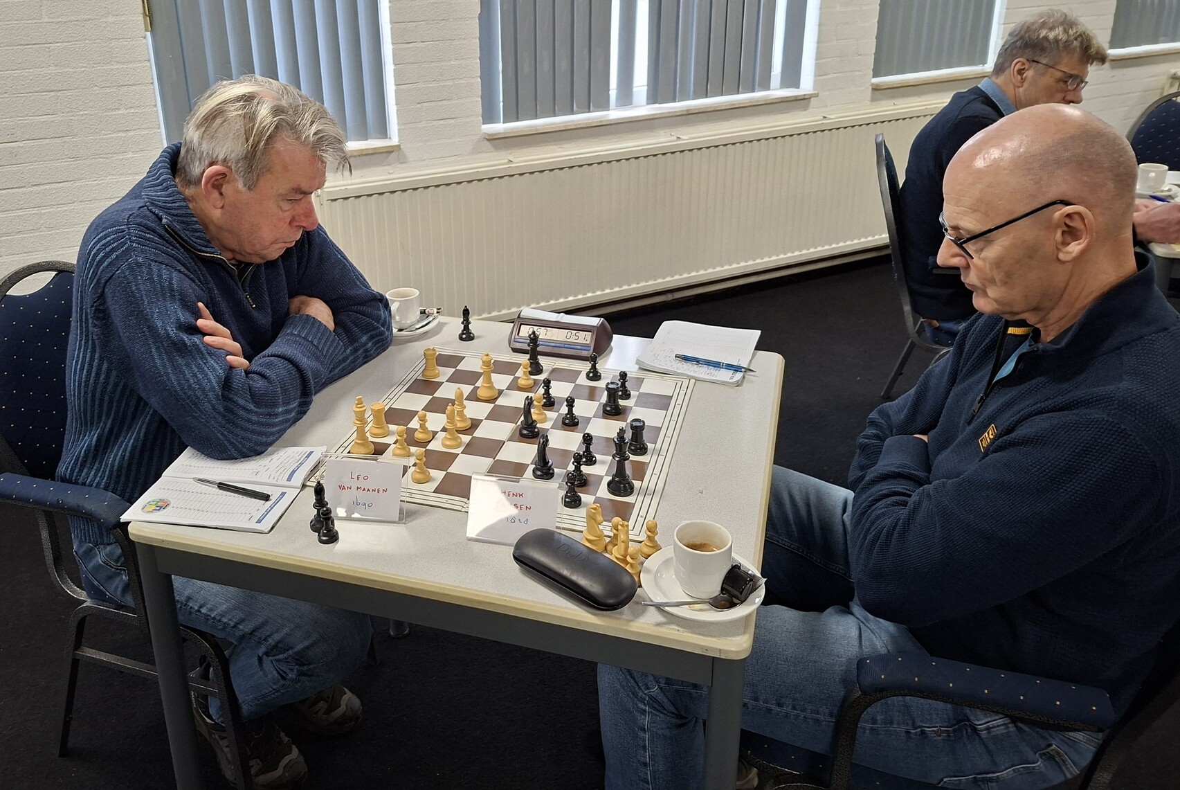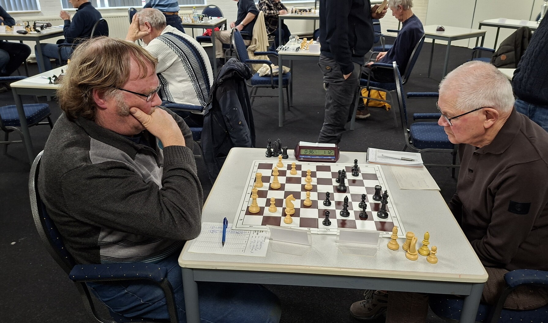 De vijfde ronde. Het begin van de jacht. Oene pakte Gert meteen aan. Een Siciliaan met b2 – b4. Het bracht Oene niet, wat hij gedacht had, want hij raakte een pion achter. Wist uiteindelijk remise te houden. De beide Auke’s speelden een mooie partij. Ik dacht even dat van der Heide het moeilijk zou krijgen. Zijn loper ( hij speelde met zwart) stond op b1. Toch verschalkte hij de andere Auke. Jan en Fokke speelden een leuke partij. Na wat paardengedoe, trok Fokke aan het langste eind. Dick en Frank hielden elkaar in evenwicht. Remise. Tjeerd won van Wim. Ik dacht dat Wim zich verrekende. Hij raakte een stuk achter, speelde nog even door, maar de partij was niet meer te redden. De partij tussen Klaas en Eelke werd remise. Maarten tegen Henk, Zahid tegen Siem en Meine tegen Ynte werden ook remise .Leo van Maanen won van Rombout, na een heel aparte Caro-Kann. In hogere zin stond Leo verloren, maar won toch. Jacob won van Gerrit, na een blunder van de laatste. Pieter Ploeger won van Bert, Leo Bosma van Herman en Eeltsje pakte zijn eerste overwinning tegen Atte.