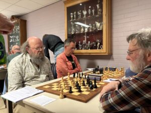Zijn tegenstander kreeg zijn stukken niet op de juiste velden en uw verslaggever ontketende een gierende aanval die in onherroepelijk mat uitliep. “Misschien wel mijn mooiste ooit!”, jubelde hij fluisterend tegen Leo, die aan bord 2 juist op dat moment remise overeen kwam.
