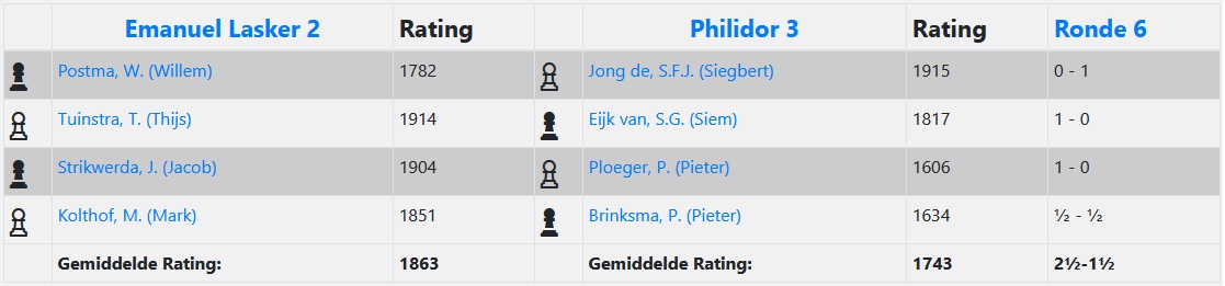 Vrijdag 27 maart 2026, de laatste wedstrijd in St. Jacobiparochie tegen Emanuel Lasker II. Er moest met dubbele cijfers worden gewonnen, maar dat kan met schaken niet. Dus moest er zo dik mogelijk worden gewonnen. Maar ook dat lukte niet. Een 2,5 – 1,5 verlies.